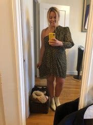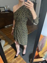 I wore this dress to a formal company Christmas party. The zipper was a little loose but I don’t think a size down would have worked. The dress has no stretch at all. The length was perfect and the puff sleeve was fun. The one shoulder cut really close to my neck and I was fixing that throughout the night but it wasn’t uncomfortable.
