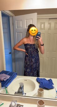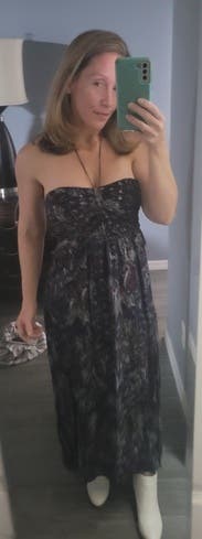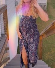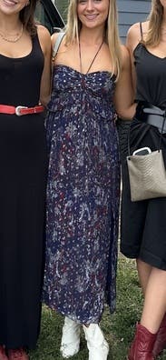 this dress looked even better in person! I wore it to an outdoor summer wedding (yes with the cowboy boots)! Was super fun and unique especially with the halter top. The chest was small on me so I couldn’t pull it up as much as I would have wanted to where the halter strings were comfy so at one point I just tied the strings in a bow and wore it as a strapless dress and it was just as cute. Would rent again!