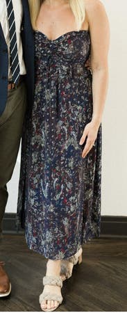 I wore this dress to a wedding rehearsal dinner, and it worked great paired with silver high heeled sandals. But it would work just as well with bare feet on a beach vacation! 10/10 would recommend and rent again.