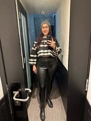 Material is stiff and the sleeves were a bit short for my liking but I try ink that's the intention. Made it work with very high waisted leggings