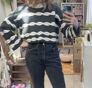 Loved this sweater! The material is great - thick and soft, and the pattern is so unique. Definitely wide / cropped / boxy, but pairs great with high waisted pants!