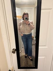 Such a great top! It is big in the shoulders (totally supposed to be that way) but I would plan on tucking it into something high waisted to give it some shape! Would make a great thanksgiving look!