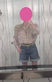 I really wanted to like this. The ruffle detail at the top is interestjng and it is 100% cotton. The shoulders fit great however, the bottom of the blouse is very wide. The model has it tucked in, so you can’t see how wide it is. It’s also slightly shorter than I expected. Overall, it did not look nice on me so I ended up returning it without wearing it. For reference, I am normally a size 10 but I rented a size 40 (8) and it was still too wide.