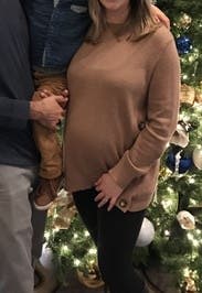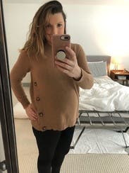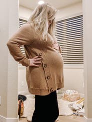 Wish I would've sized down. This sweater is the perfect camel color for fall and winter! The weight was great and it was breathable but it still ran a little big big even with my 25 week bump!