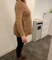 Nice sweater that overall was very warm. The arms were a little short on me which ultimately made me not comfortable to wear it. The fit is loose and not like other maternity sweaters that cling and highlight your bump. I'm 26 weeks in the photo and didn't end up wearing it. I just felt large and not as flattering, I may end up renting again later in pregnancy.