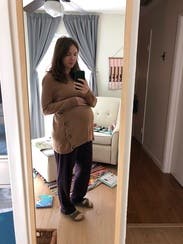 This sweater is loose and works well for third trimester. I liked the cut and design. My only complaint is that the material was itchy around the neck.