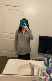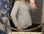 This is a nice, comfy sweater. Nothing remarkable, but at 37 weeks I'm just happy to have something that looks normal, fits, and keeps me warm--much more presentable than my husband's hoodies! I sized up but probably didn't need to--fits well but with extra room.