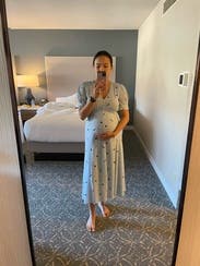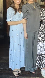 I rented this for my sisters baby shower. My normal size fit perfectly, the material is a gorgeous high quality and it's easy to wear. Very flattering and the puffed shoulders are a sweet detail.