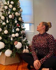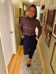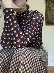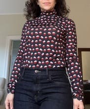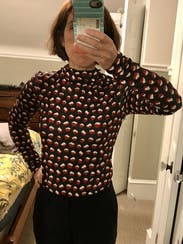 Wore this to Thanksgiving dinner; it gave a bit of fashion with the pattern and fit but also was very comfortable. The length of the torso was enough to tuck without bulk. The turtleneck and sleeves were also perfect. Love the modern dot pattern. The background is more of a cool, deep grey. It paired well with navy Trina Turk RTR trousers.