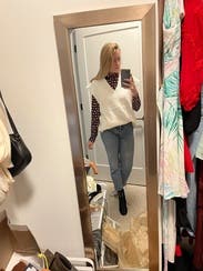 I'm between sizes. I could easily have sized down as it was a little loose, but it worked just fine. So easy to pair with loads of items in my closet.