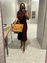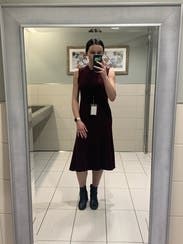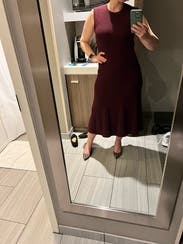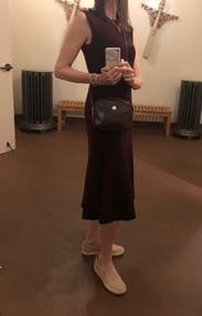 nice work dress, was nervous about the silhouette around my stomach but was more flattering than anticipated. it's a thicket sweater-like material so not perfect for summer, but did ok transitioning between hot outdoors and AC indoors.