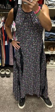 Whew, loved this dress! Managed to wear it to like 4 occasions over the course of a month. Considered buying it but probably everyone I know has seen me in it now so, sending it back. I liked the side zip/side snaps and felt like the overall effect was slimming plus it was so comfy to wear. Pockets would have made it 100 percent perfect.