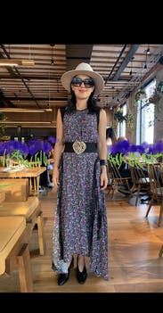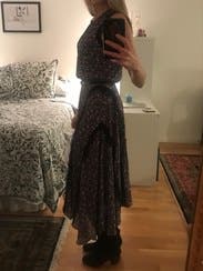 I like the flowy and lightweight feel of this dress. It has nice movement and I like the design details. Since I am more petite, I found this dress to be a little long without heels on, the asymmetrical hem is longer on the sides and grazes the ground if I am in flat shoes. Also, a helpful tip for ladies with a shorter torso, like me, the waist line falls below the belly button and creates this feeling of being too big and saggy up top. I pulled the waist up to my natural waist and put a tight and thick belt on, so my waist looked more defined and the dress was more flattering. I had issues with one of the tiny side snap closures, it wouldn't snap in place, so, I left it open, but, wasn't too noticeable, especially, since I had a belt on. Overall, I like the look of this dress, but it was ill fitting for my frame.