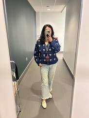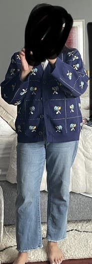 I am petite in the shoulders, torso, but do have a mom tummy and larger bust. This was super cute and flattering- sleeves were just the right length - fun piece for spring when it’s still a little chilly out. I usually wear a medium, RTR suggested large, but based on reviews I went with small - it’s a great fit.
