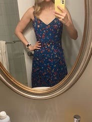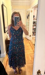 I planned to wear this for some semi-formal events (rehearsal dinner, etc) but didn’t love the way the top fit. The bust fit okay but the feathery fabric ruffles that ran along the seams down the front of the bust and waist made me look “fluffy”/bigger. I also didn’t think the spaghetti straps and neckline were super flattering when the straps were sufficiently tightened to make the top fit. The size 4 was a little tight in the hips for me (usually a size 6) so I’d say this is more of a sheath and less of an A-line. If you’re a pear, it may be tough to fit both hips and bust nicely in this. Ended up layering a cropped sweater over it for work and really loved it that way!