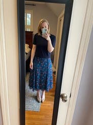 Fits tight on the hips and belly, so it's almost too formal for work and daytime. But I made it work by layering a sweater over it. Colors are gorgeous.