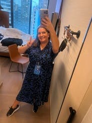 Idk if i didn’t love this because i rented the six to fit the bump or it was just good not great. It was comfortable and a light weight fabric which was ideal in the summer heat. The fabric was so hard to steam but the print helped hide the wrinkles that wouldn’t go away. I also felt like the arm bands were really tight but had a button to adjust. Definitely would have done a 4 or maybe even a 2 for my normal size.