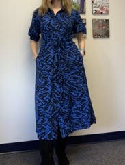 Blue printed twill (100% Polyester). Shirtdress. Short sleeves. Collar. Front button closure. 48" from shoulder to hemline. Imported.