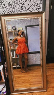 So cute and true to size! Perfect for a date night or a girls night. It’s a little short but doesn’t ride up because of the bottom. I will be renting again!