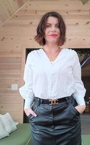 I love that this white shirt is a little different...larger baggy fit with interesting sleeves, looks great tucked in with wide high waist jeans. Super comfy light cotton.