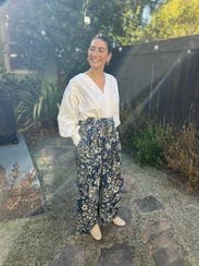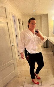 I loved this! I wore it for a work conference with black & white gingham pants. I think it’s a super fun alternative to a plain white button-down, and I didn’t have any gapping at the bust like I often have with button-downs.