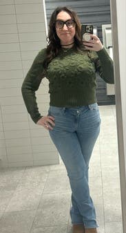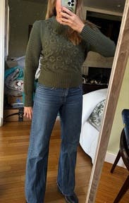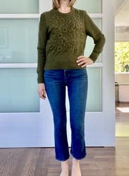 I love this sweater. It is thick, warm, and a little bit itchy, but I can tolerate the itch because it’s adorable. I was afraid that the flowers would make it seem too Holly Hobby but they work to make it more interesting than my other plain sweaters. I am 5’9”, 135 lbs and the size small fit me perfectly. I paired it with Paige Claudine Cropped Flared jeans.