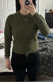 It’s a nice soft sweater. Runs a little big. The floral embroidery is cute.