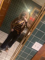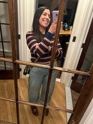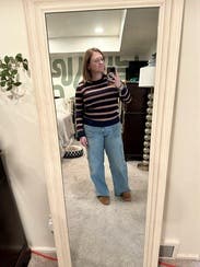 Please don't mind the fact that I am wearing a sports bra, with the right undergarments this sweater would be nearly perfect. It is on the thinner side so great for temps around the 50's but not the 20's we have right now. Will either buy or rent again