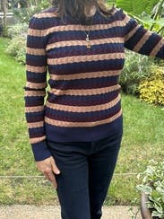 I wore this top in 50s-60s weather and it felt comfortable and relaxed. The colors are “serious” enough for work and the patterns and texture make it seem a bit less frumpy