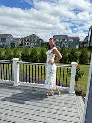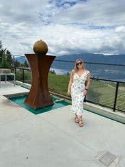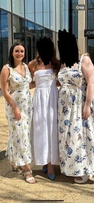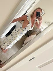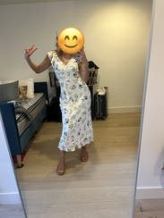 I rented the black and white version of this dress (it comes in multiple colorways/prints) and finally bought it because I loved it so much. I wanted to try it in this color and I'm glad I did! I wore it on my honeymoon and it was a great dress for going out to dinner. I wish I had a steamer because the white fabric does wrinkle easily. This dress fits my body shape nicely and gives me more of any hour glass look (not super evident in this picture but in my brain I will remember it doing so). I have a large chest and this was super flattering. I used to wear the black/white one without a bra but if you want extra nice cleavage wear it with a bra and who cares if the straps show in the back, c'est la vie. Felt beautiful in it and was very happy to have rented it!