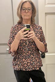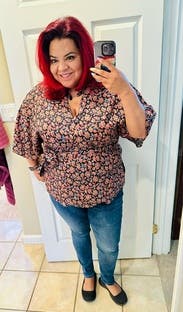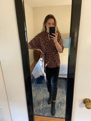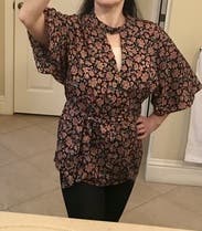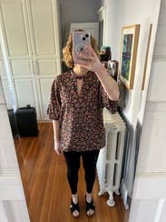 This is such a cute top. I felt great in it leaving the home. Love the pattern and will rent the dress from the designer! I overestimated my size because I didn’t want it to be too small/tight in the bust area (34D) but could have gotten away with the M I think. Warning: I do video calls during some of my work day and found the flowery pattern distracting/messes with your eyes on video. No one complained.