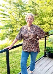 Love the colors of this blouse. Comfy and not fussy to wear. Dressed with down jeans and Birkenstocks and up with black pants