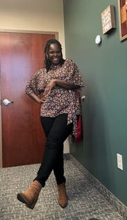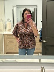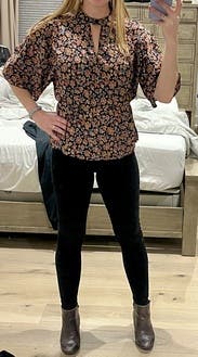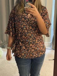 Loved this top! Matched well with brown pants and so cute for Thanksgiving. Fit perfectly and really comfortable with the tie waist