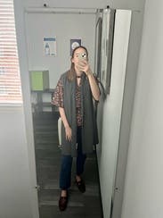 I wore this once for zoom calls from home and once on a vacation to a nice museum and out to dinner. It is a beautiful piece. It has a low neck slit that is fine but the top shifts if you wear a purse, revealing my bra, so I didn’t feel comfortable wearing this to the office.