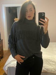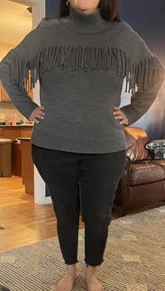 I wore this a few times, both to work and after hours. You can dress it up or down. Got lots of compliments on the fringe! I should have gone down a size, but the large was fine for a sweater. It didn't look bad and was cozy, but the arm holes were just a bit big. Mock neck wasn't restricting!