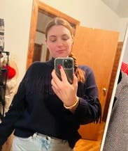 Beautiful Sweater - love the fringe! It is so comfy and looks so cute with lighter jeans. Thought about buying!