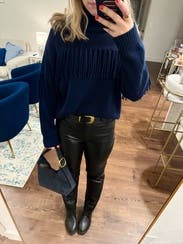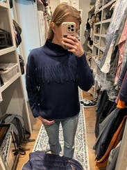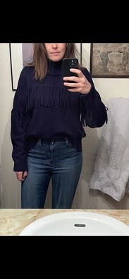 The fringe is everything! Would’ve bought if not so $$$ but at the same time the turtleneck is short and so it doesn’t have the slimming affect of most turtlenecks. And it runs very big. Would’ve loved a sexy snug fit but didn’t want to risk it not fitting at all. It was a v high production value so felt luxurious and expensive (which it is)! Amazing color! Not itchy at all. Maybe size down and feel posh af?!
