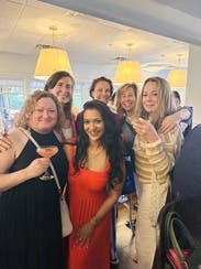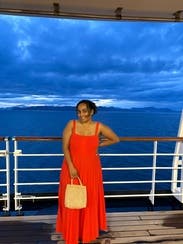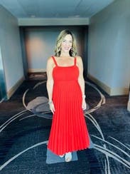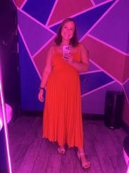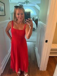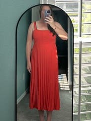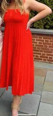 Great pop of color and very forgiving in waist and hips. I should have ordered a size down as the straps kept falling down and was a little big in the chest. I will rent again in a smaller size. Tons of compliments