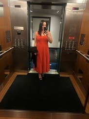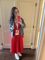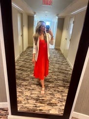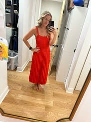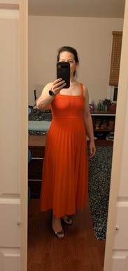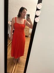 It’s a beautiful color but I’m still not sure if it’s red or orange, kind of an in betweeen. Fits TTS. Very thick material. I wore with heels but could easily be dressed down for a more casual event too.