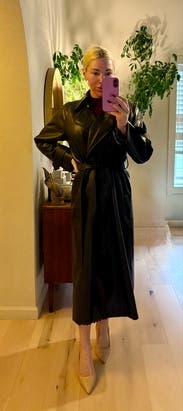 The Jason Wu x RTR Navy Faux Leather Trench Coat is a stylish and structured piece. For a versatile look, wear it belted over a dress for an elegant outfit or with trousers and boots for an elevated casual outfit.