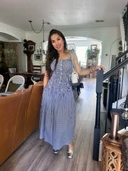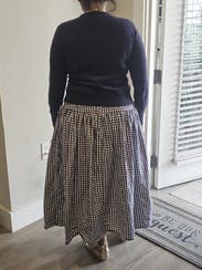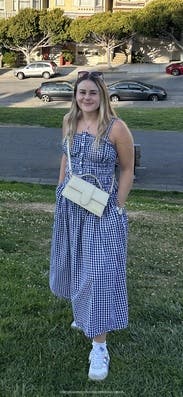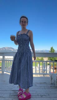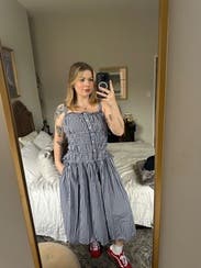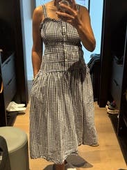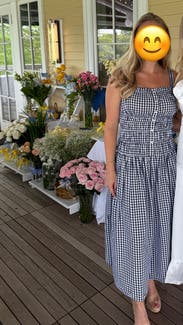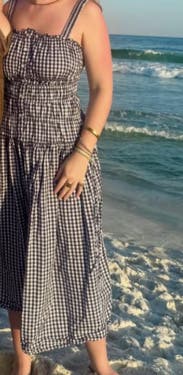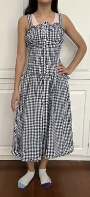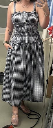 Follow the yellow brick road in this CUTEEEE gingham dress✨ I said that the dress fit just right but it was a tad large on the bust area. I didn’t wear a bra bc I felt supported throughout the stomach area and shoulder straps but did notice that the fabric would be super gaped when washing my hands/bending over a little. Also- my dress was missing some if the elastic on the left side of the neckline. On the photo it’s on the right side, you can see that one side is ruffled and the other side is flat, which was pretty noticeable when wearing it 😭 Other than that- i really loved it!!! Oh, yes there’s pockets, NO you can’t unbutton the buttons