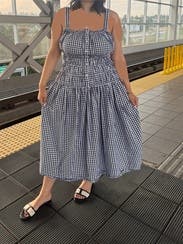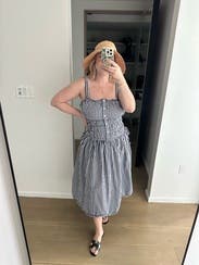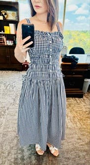 This Jason Wu Collective dress features a charming gingham pattern with a fitted bodice and flirty ruffled hem, offering a playful yet sophisticated summer vibe. Pair it with simple flats and a woven bag for a chic, picnic-ready look.