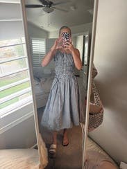 I don’t have pictures of the back, but that makes this stress extra special. Fit and flare with the corset cupping, and side string bowtie details really elevate the gingham dress look