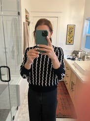 Loved the quality of this sweater material. It's more of a woven stretchy material than a traditional sweater. The pattern was fun. Could have sized down to an xs, but the small worked too!