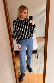 The knit is a little open in places and not itchy but ever so slightly scratchy so I paired with a long-sleeved tee underneath and it was great. Warm! Cute with cream trousers or jeans.
