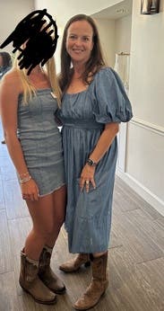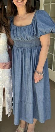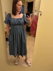 Loved this dress as I could wear it to work and on the weekend for a fall farm day playdate. It was flattering (sorry, didn't get a pic) on my hourglass figure and hit at the perfect place on my chest to not reveal cleavage so it was casual work friendly. The weight is light enough for summer but heavy enough to transition into fall. I wore with platform sandals, but could easily wear ankle or full boots. Definitely would have purchased at a lower price point. Will likely rent again for late October/November.