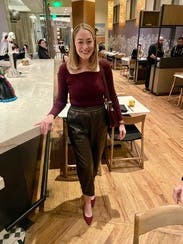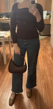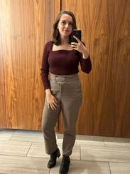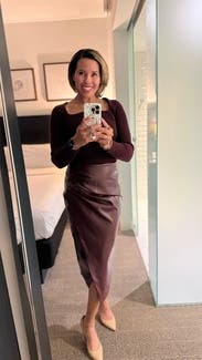 This is such a great fall fit. Wears true to size and feels so fall glam for work. The sweater is a perfect compliment to the vegan leather skirt, definitely rent them together, the colors work so well.