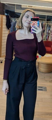 I thought this top was very flattering. I loved the color and the look with the slight "bump" in the neckline which was pretty wide so I had to try a few bras before deciding on one. It was perfect for a business trip that I went on and I paired it with some pants also rented from RTR.