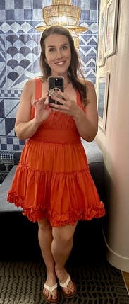 It’s all perfection. I loved this bright orange dress and found it easy to dress up or down depending on the shoe choice. Felt super girly and feminine in it because of the ruffles and bouncy bottom hem. This is another dress that I considered buying. My only complaint is that when you sat down sometimes the straps fell off your shoulders. If I was keeping the dress I would probably shorten the straps so they didn’t do that. I have a long torso too and I am tall so I suppose that people with shorter torsos might even have a bigger problem with this. But it’s definitely not a dealbreaker. A minor inconvenience for an adorable dress!