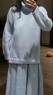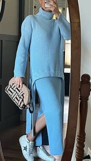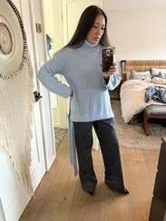 The sweater is oversized, and you have to balance it out with something that is quite tailored on the bottom. Gorgeous color.
